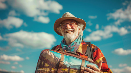 An older gentleman with a white beard and glasses smiles warmly while wearing a hat. He stands in front of a vibrant world map, surrounded by travel-themed items.