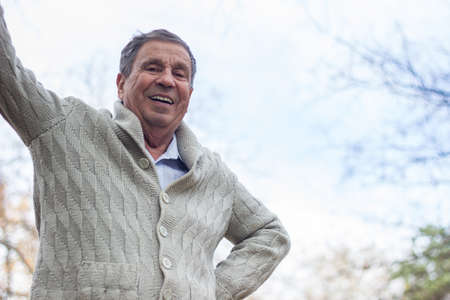 Portrait of happy senior man standing in the park. Elder health and retirement concept