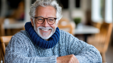A senior citizen smiling warmly in cozy sweater, enjoying life