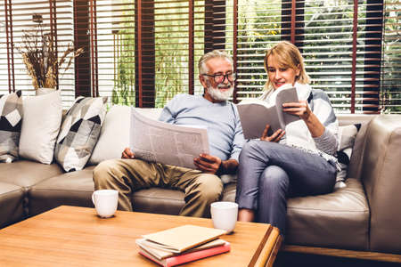 Senior couple relax talking and reading newspaper together on sofa in living room at home.Retirement couple concept