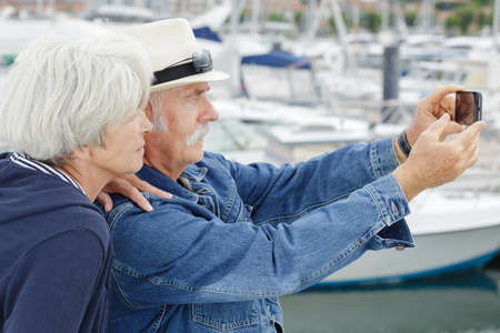 Side view of active senior couple taking selfie with mobile phone standing at the beach with ocean and mountains in the background. They are happy