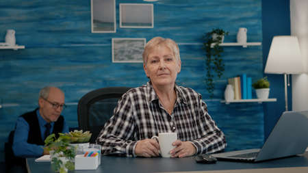 Senior focused woman looking at camera sitting in workplace at desk working from home while old wife watching tv in background. Retired business person prepared for online meeting using moden gadgets