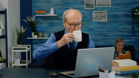 Tired elderly man sitting at desk and taking a sip of coffee, looking at laptop working from home workspace while his wife is reading a book in background. Focused old entrepreneur checking graphics