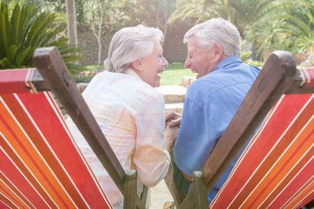 An elderly couple joyfully discusses their upcoming travel plans over coffee in a trendy caf