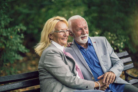 Back view of aged couple spending week end in park. Grey-haired husband and wife resting on bench outdoors, dreaming talking of life, looking far. Happiness, healthy lifestyle of aged people concept
