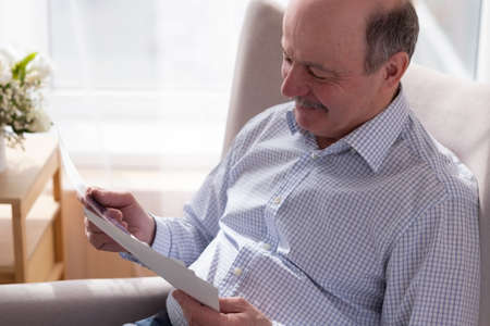Elderly caucasian man holding vintage photograph at home, reflecting on warm memories. concept of nostalgia, heritage, emotional connection to the past.