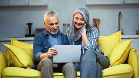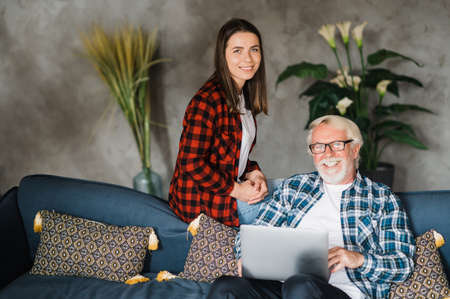 Granddaughter and grandfather. A gray-haired smiling grandpa sits on the couch with laptop, and his granddaughter sits next to him, they look at the camera and smile