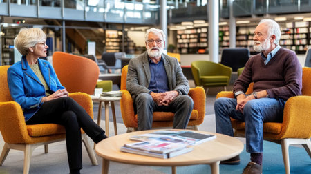 Senior leader smiling and talking to younger colleagues during a mentorship meeting in a corporate office