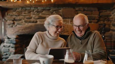 A senior couple, seated at a rustic table in front of a stone fireplace, shares a lighthearted moment, laughing together as they look at a tablet.
