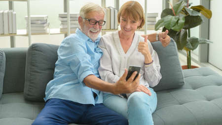 Caucasian happy seniors elderly are video calling to family or friends, relax at home, smiling healthy senior retired grandparents, older grandparent technology concept