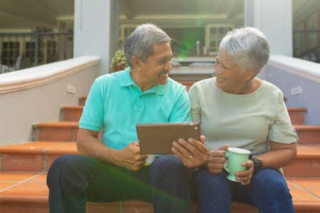 Smiling biracial senior man holding digital pc talking with wife holding cup while sitting on steps. wireless technology, drink, unaltered, lifestyle, love, togetherness and retirement concept.
