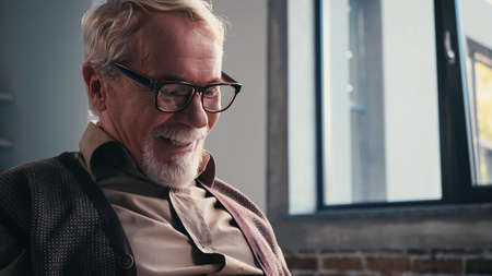 cheerful and beaded retired man in eyeglasses looking down