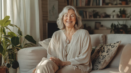 A cheerful senior woman sits on a beige sofa, enjoying a relaxing moment at home. Natural light streams in, creating a calm and peaceful atmosphere.