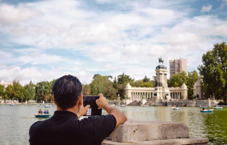 man or boy taking photo with his smart phone at the Monument the The Buen Retiro Park - Parque del Buen Retiro, Madrid