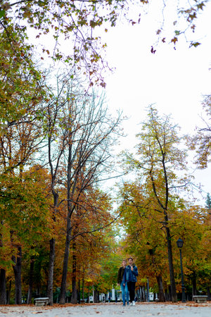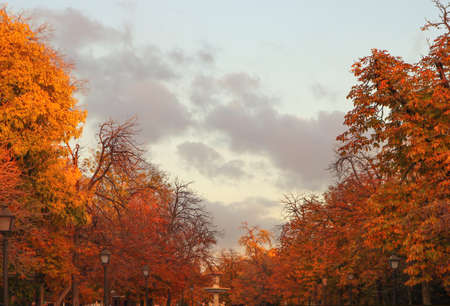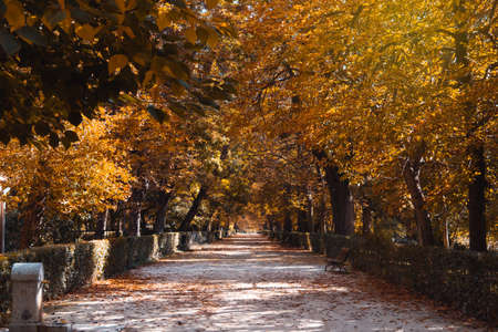 Fail. Autumn path in the Parque del Retiro in the city of Madrid with the leaves of the trees in autumn colors on the branches and on the ground. InSpain. Photography. autumn-time
