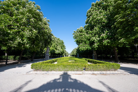Madrid, Spain - April 12, 2024 - Walk of Statues in El Retiro Park in Madrid, Spain on sunny spring morning.