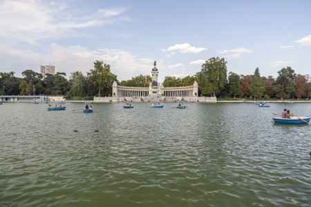 Madrid, Spain - May 30, 2015: Tourists and locals enjoy the Summer heat rowing in the main pond and resting under the monument to Alfonso XII at the Retiro Park (Parque del Buen Retiro) in Madrid, Spain.