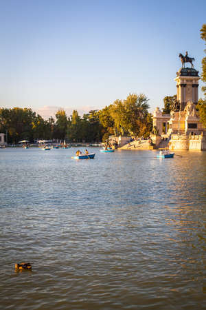 Boats at the lake at the park of Buen Retiro with monument of Alfonso XII King of Spain at sunset, Madrid, Spain