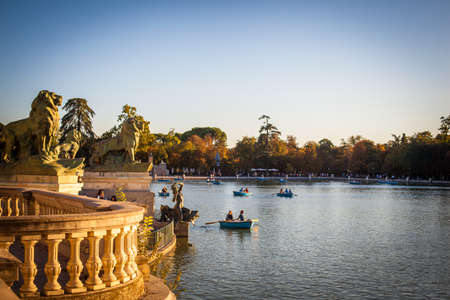 MADRID, SPAIN - NOVEMBER 9: People relaxing in rowboats in the scenic pond of Buen Retiro Park in a sunny autumn day, on November 9, 2013 in Madrid, Spain