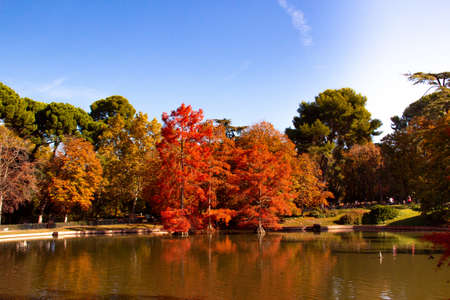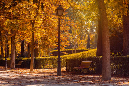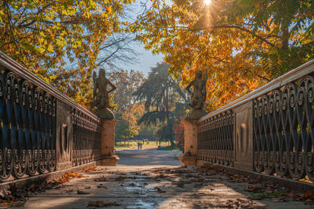 Warm Autumn day in the beautiful gardens of flowers, shrubs, trees and green space in Retiro Park of Madrid, Spain. Bright sunshine on unusually warm November day.