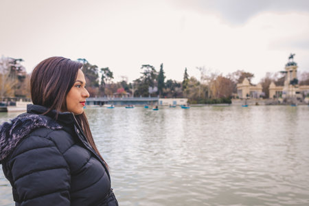Young latin woman looking at the horizon at the lake in El Retiro Park in Madrid, Spain.