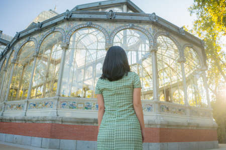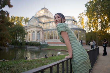 lifestyle portrait of young happy and attractive Asian Korean woman relaxed taking a walk on city park enjoying travel getaway in Spain during Autumn holidays travel