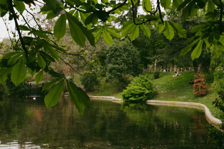 A lake, pond with calm water in a spring or summer botanical garden, park. Urban nature. Harmony and tranquility. Green trees in a parkland.