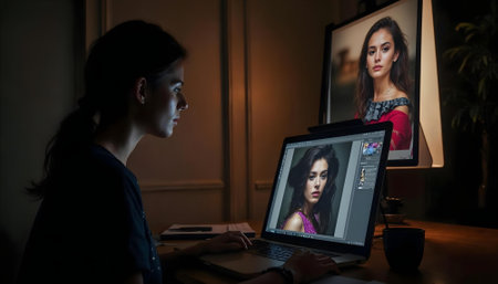 The scene captures a closeup of dual monitors displaying vibrant photo edits with the soft glow of the screens reflecting on the photographers face highlighting their concentratio