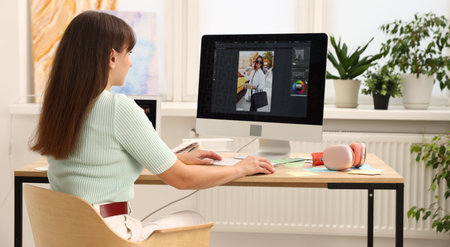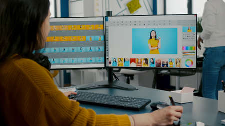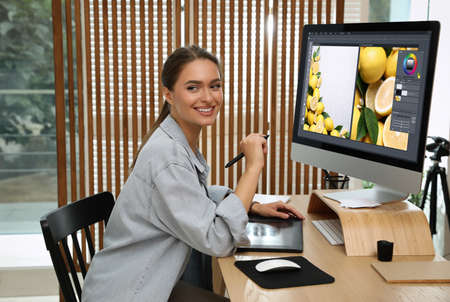 Woman designer, photo editor specialist working at pc in creative office environment using stylus pencil. Retoucher woman retouching fashion assets in digital graphics editing software, color grading