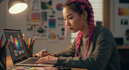 a young asian graphic designer is working on her laptop at her home studio creating digital art and design with pink braids and a focused expression