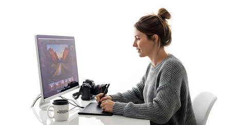 Photographer retouching new shooting at computer using graphic tablet and stylus
