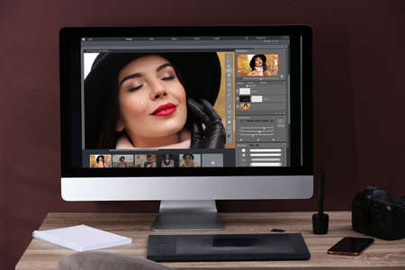 Retoucher's workplace. Computer with photo editor application, camera, smartphone and graphic tablet on table indoors