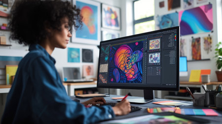 A talented artist focused on digital illustration using a tablet in a modern workspace, surrounded by vivid lights and colorful design elements.