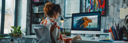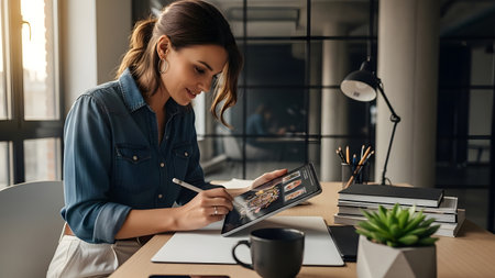 A young woman is engaged in artwork on a digital tablet in a stylish office. The warm light enhances her focus and creativity as she brings ideas to life.
