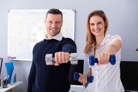 Close-up Of Male And Female Businesspeople Exercising In Office With Dumbbells