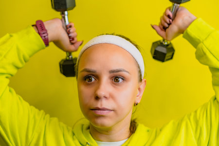 Woman in a yellow hoodie working out with dumbbells in front of a bright yellow background. She is lifting the weights with both hands, and her face is focused on the task at hand