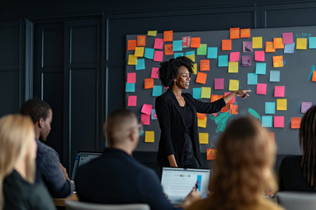 A group of people are looking at a whiteboard with colorful sticky notes on it. Scene is collaborative and focused, as the group is working together to brainstorm ideas