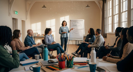 A woman stands next to a flipchart presenting coping strategies to a diverse group of people seated in a circle. The setting resembles a support group meeting, therapy session, or a corporate mental health workshop.