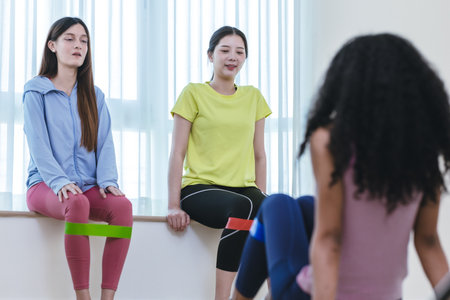 A group of multicultural women engaging in a resistance band workout together in a bright indoor setting. The image captures teamwork, fitness, and the joy of exercising in a supportive environment.