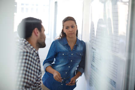 I was thinking the same.... Cropped shot of two colleagues discussing work at a whiteboard.