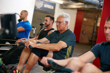 Still keeping pace with the youngsters. Cropped shot of a group of men working out on the rowing machine at the gym.