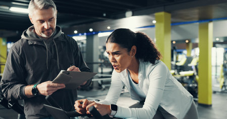 Personal trainer, talking and group with membership in gym, explaining and info for training routine. Wellness, instructor and man with tablet for digital sign up, online and benefits of health club