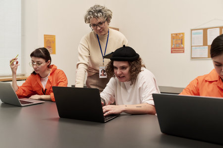 Middle aged Caucasian woman supervising diverse group of young adult women in orange uniforms working on laptops in classroom setting, focusing on prison education and digital learning