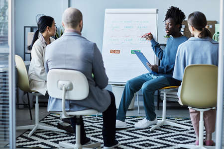 African american man in casual wear standing near the glass office wall with financial points, explaining planning and business strategies to colleagues, creative solutions on brainstorming session.