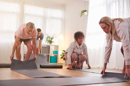 Group Of People Unrolling Exercise Mats Before Start Of Fitness Or Yoga Class In Community Center