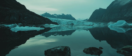 Stunning floating icebergs reflect in calm glacier bay surrounded by rugged mountains