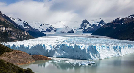 A breathtaking landscape of a massive glacier surrounded by snow-capped mountains and a serene lake