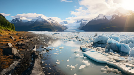 AI generated a large glacier lake. The image features glacier melting, nature landscape, mountain range. Additional elements include fantasy landscape, ocean waves.