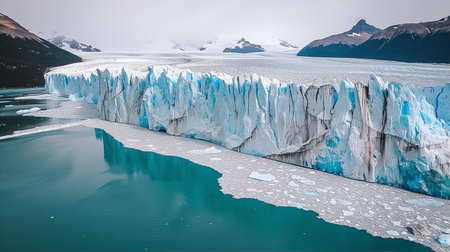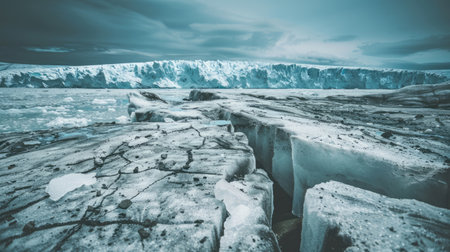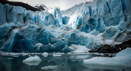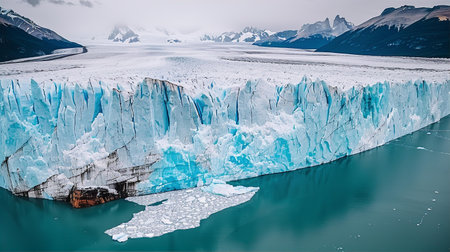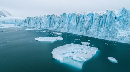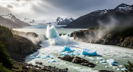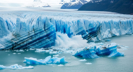 Generative AI, Glacier ice calving into the ocean, climate change concept, reminder of the fragility of Earth's ecosystems and the urgent need for climate action
