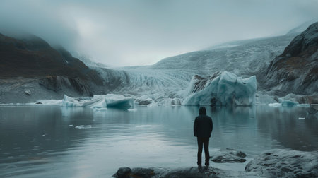 A person documenting the effects of climate change on a shrinking glacier, underscoring the importance of water conservation